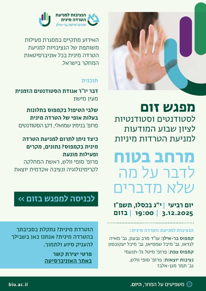 יום רביעי 3.12.25 מפגש זום - מרחב בטוח - לדבר על מה לא מדברים לציון שבוע המודעות למניעת הטרדות…